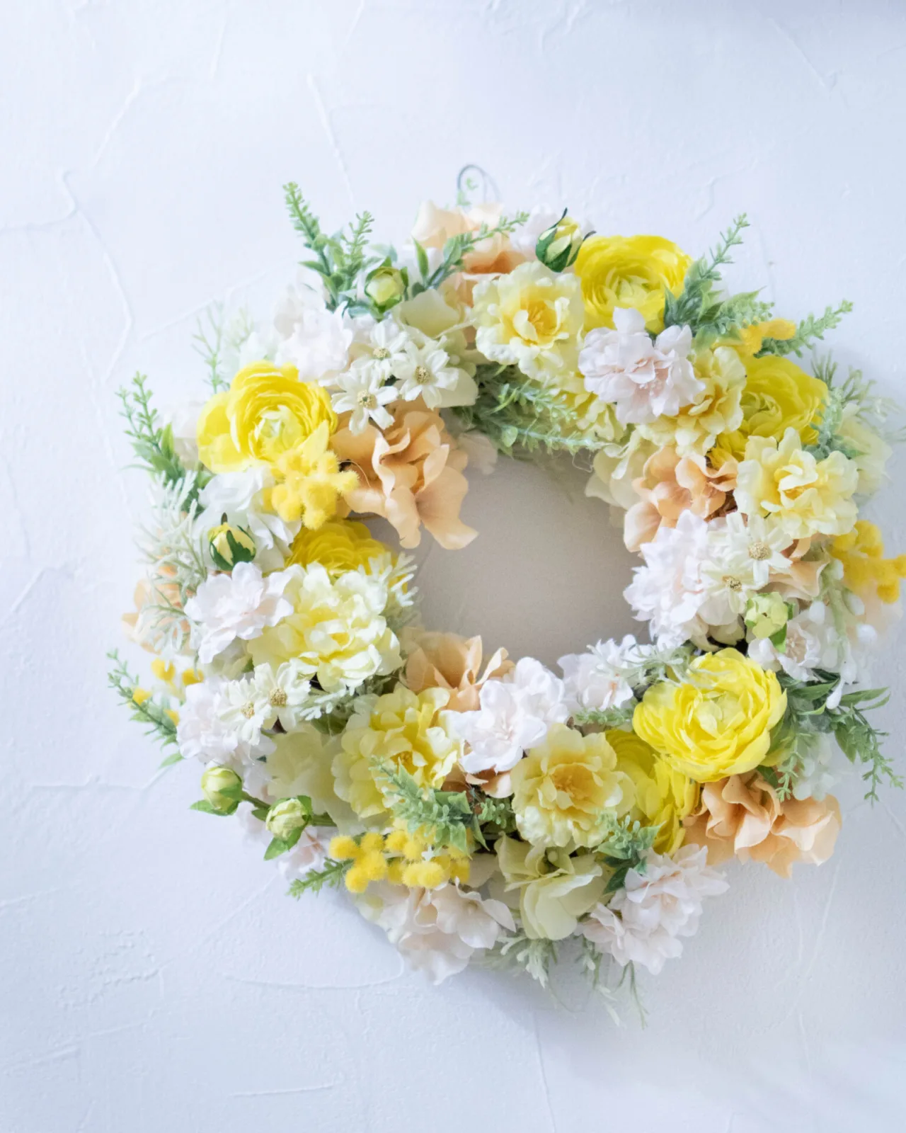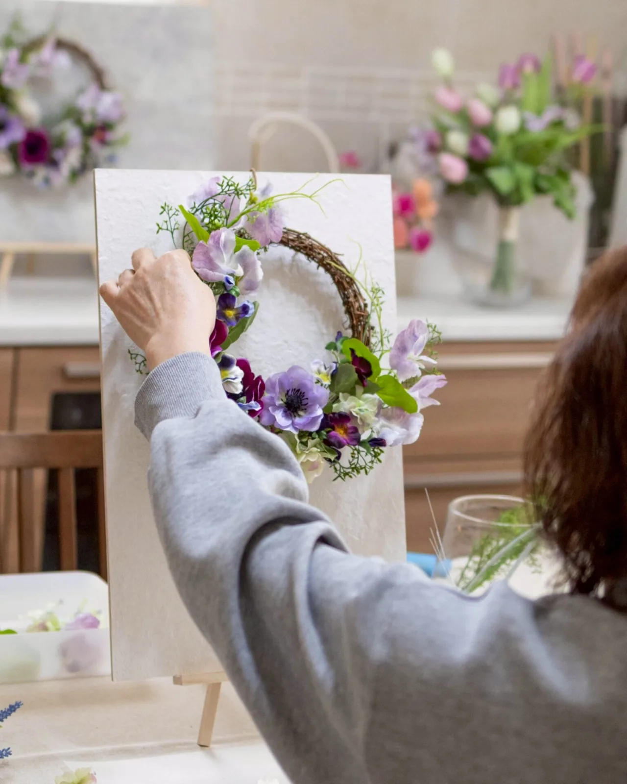 丁寧にリースと向き合い、花の役割や色の重なり、立体感のつけ方を学びます。